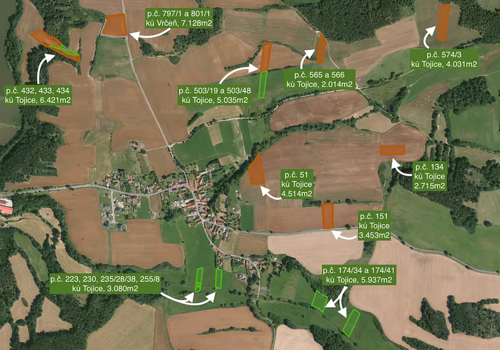 Nabízíme ke koupi soubor zemědělské půdy o celkové výměře 44.359m2 nacházející se v katastrálním území Tojice zapsané na listu vlastnictví č. 824 (37.231m2) a kat.území Vrčeň na listu vlastnictví č. 983 (7.128m2). Pozemky jsou převážně využívané jako orná půda a jsou pronajaté místní společnosti do konce zemědělského roku 2030.