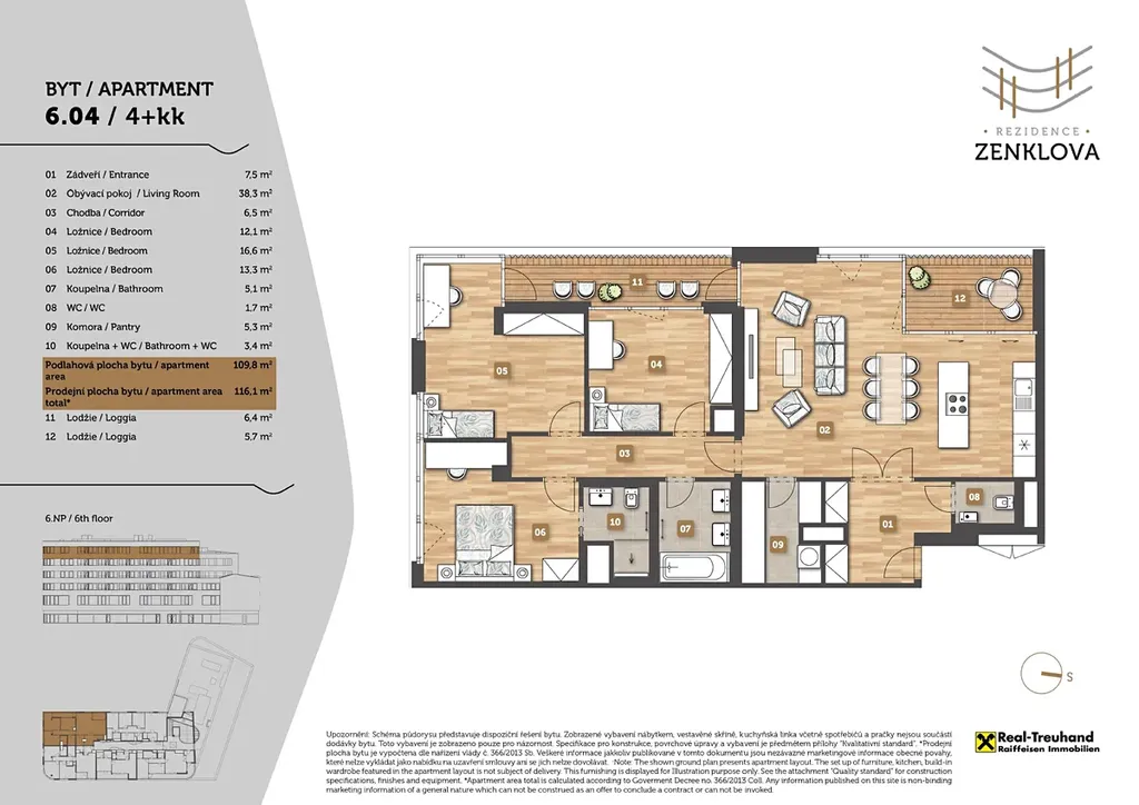 Byt 6.04 s dispozicí 4+kk o ploše 116 m2 a dvěmi lodžiemi se nachází v posledním 5. patře a skládá se z prostorné předsíně, velkého obývacího pokoje s kuchyňským koutem a vstupem na lodžie, ložnice s vlastní koupelnou a WC, dvou dalších pokojů, hlavní koupelny s vanou a dvěma umyvadly, velké komory s pračkou a druhého samostatného WC. Byt má technickou přípravu pro instalaci klimatizace. Všechny jednotky v domě jsou vybaveny exteriérovými hliníkovými žaluziemi s elektrickým ovládáním. K bytu je možné dokoupit druhé parkovací stání i sklep. Více informací naleznete u našeho prodejce.