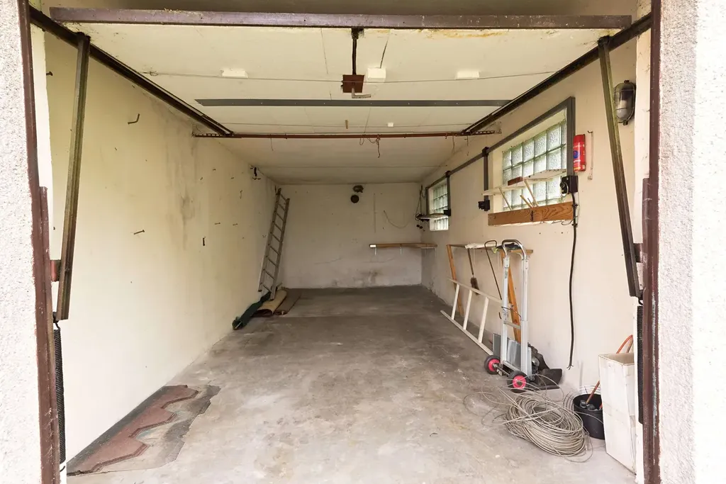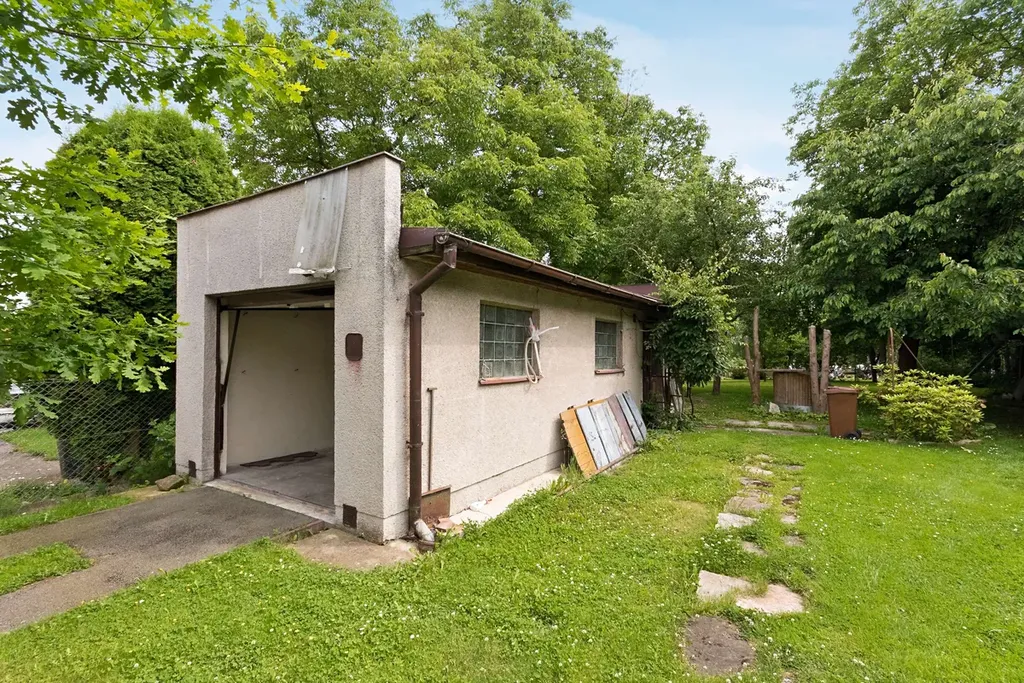 K domu náleží též samostatně stojící garáž s možností parkování jednoho automobilu, která má v zadní části z venku přístupný sklad zahradního nářadí a velká zastřešená pergola s grilem.
