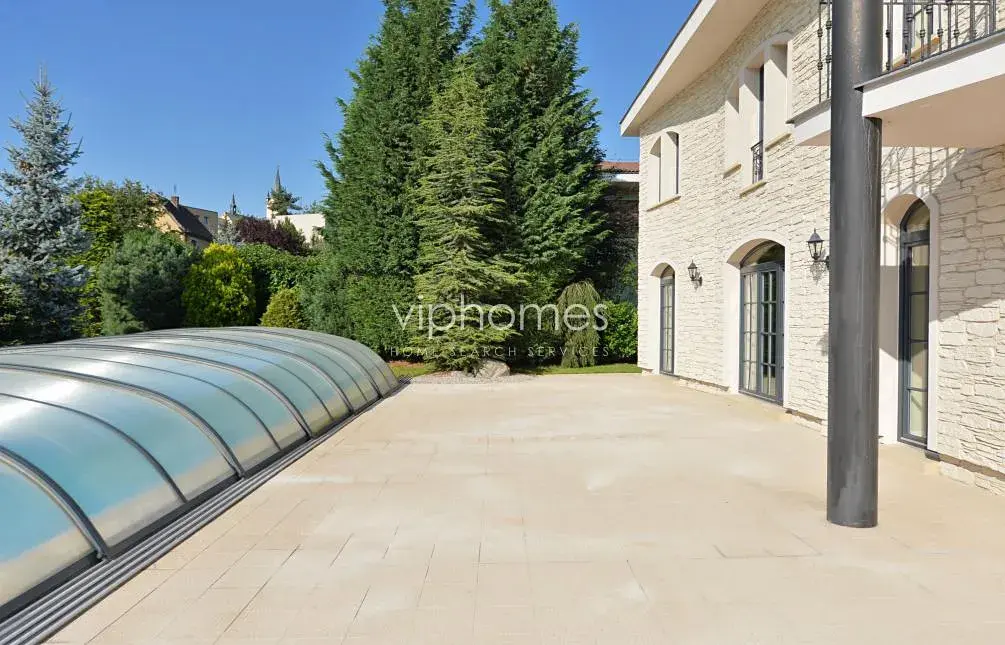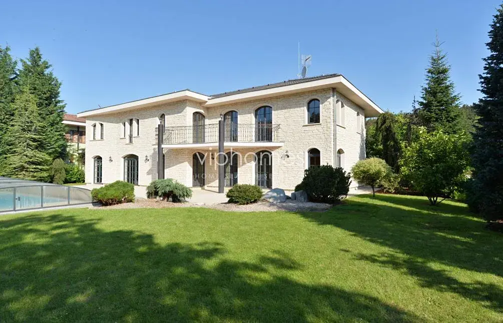 Velkoryse navržena moderní vila s krytým, vyhřívaným venkovním bazénem, saunou a rozsáhlou zahradou v sousedství přírodního parku Tichá Šárka a mezinárodní školy ISP v Nebušicích.
