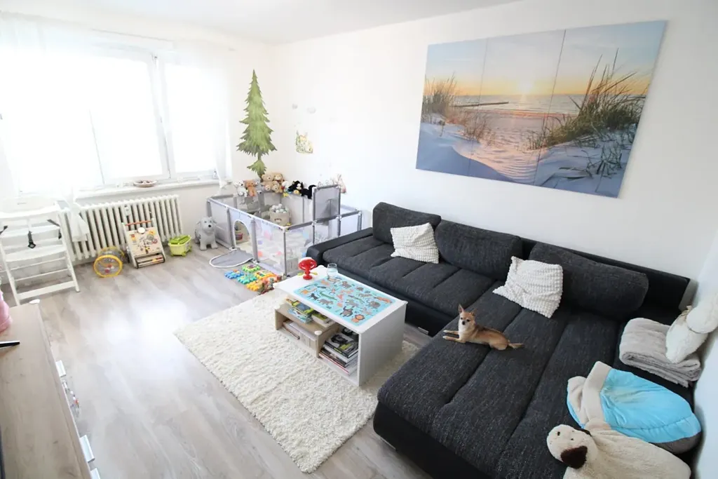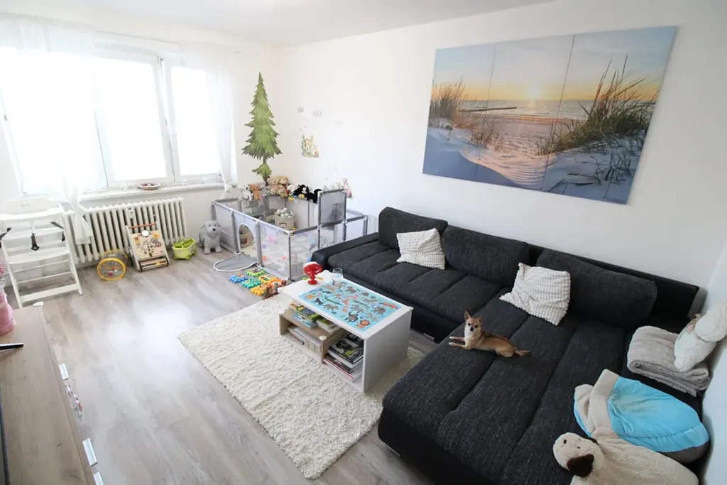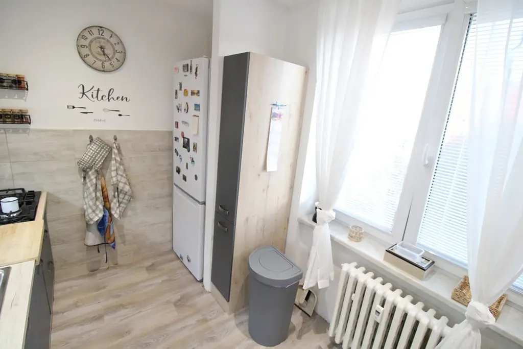Velkou výhodou je příjemná dispozice bytu a dostatek přirozeného světla, díky čemuž působí velmi vzdušně a útulně.