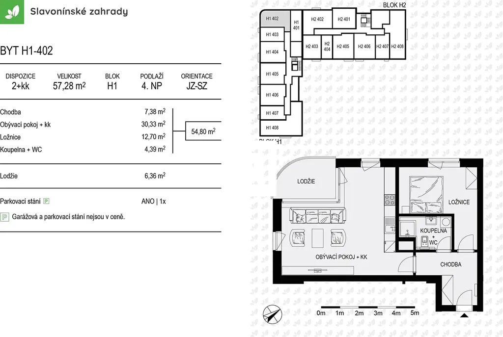 Byt s podlahovou plochou 57,28 m2 + balkon 6,36 m2 nabízí naprostý klid,