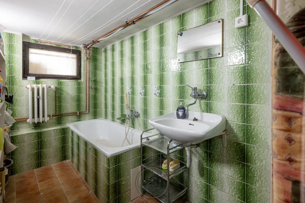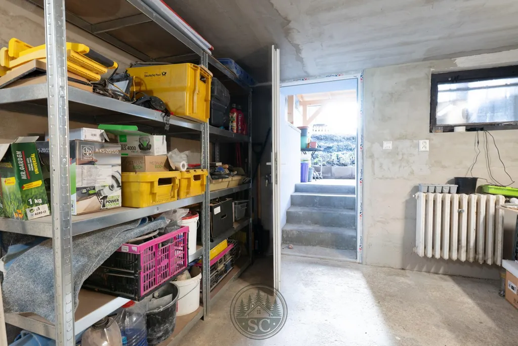 Součástí domu jsou také sklepní prostory, kde je možné vybudovat další dvě místnosti. V současné době se zde nachází původní koupelna s WC, technická místnost s plynovým kotlem a vstupní místnost se vstupem ze zahrady.