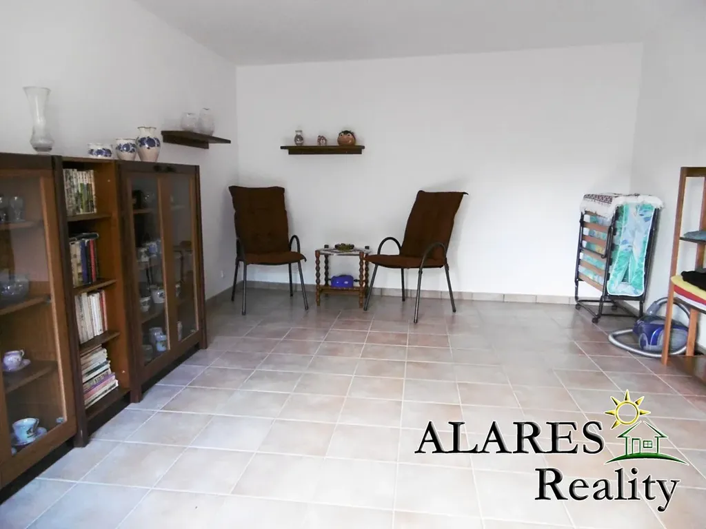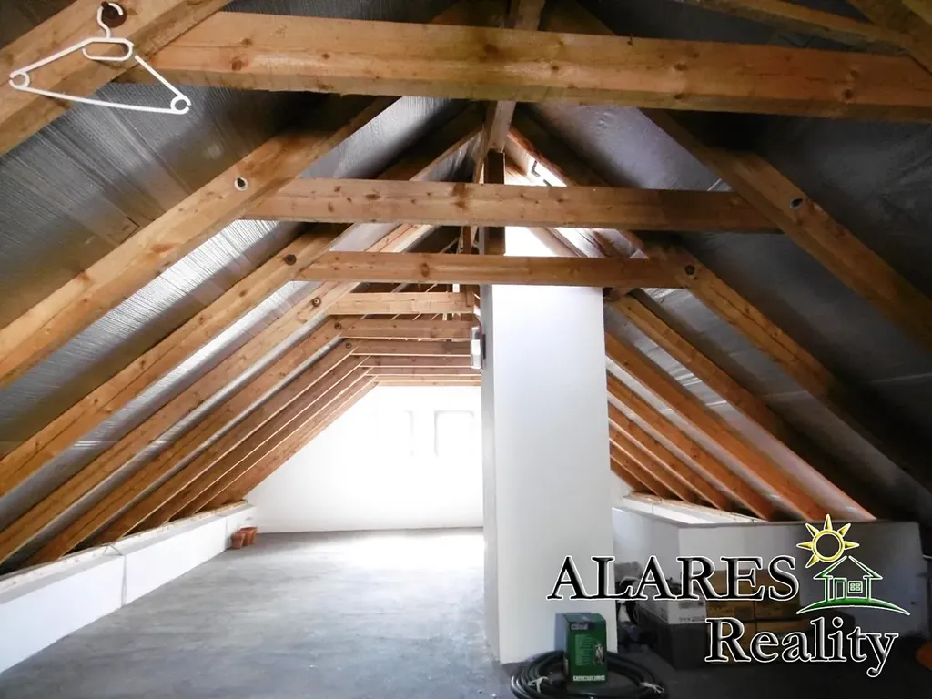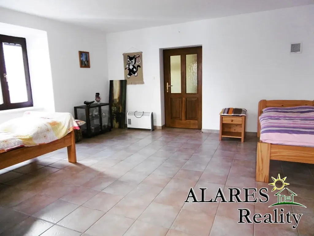 Bývalá hospodářská budova předělaná na technickou místnost, komoru, dílnu, dvojgaráž (el. vrata na dálkové ovládání), sklípek, a nad tím vším opět prostorná půda.