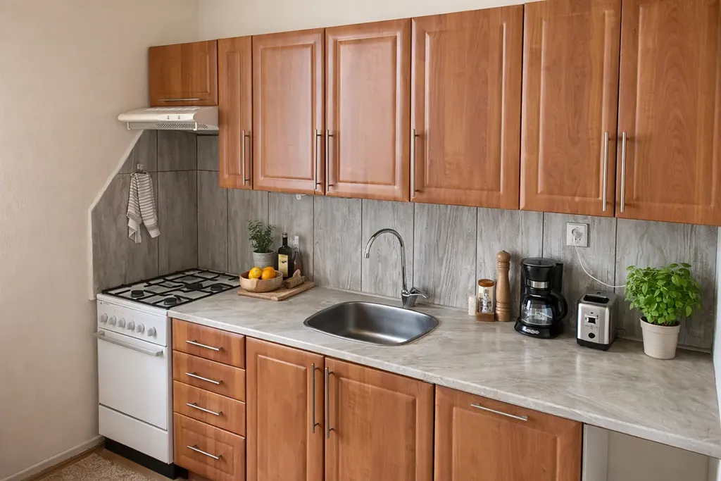 V celém bytě plovoucí podlahy, plastová okna, vytápění plynem, ohřev vody v koupelně el. bojler, WC, sprchový kout a umyvadlo. V kuchyni kuchyňská linka, jídelní stůl, židle, plynový sporák s troubou, přípojka na automatickou pračku, dále vstup z kuchyně do prostorného pokoje.