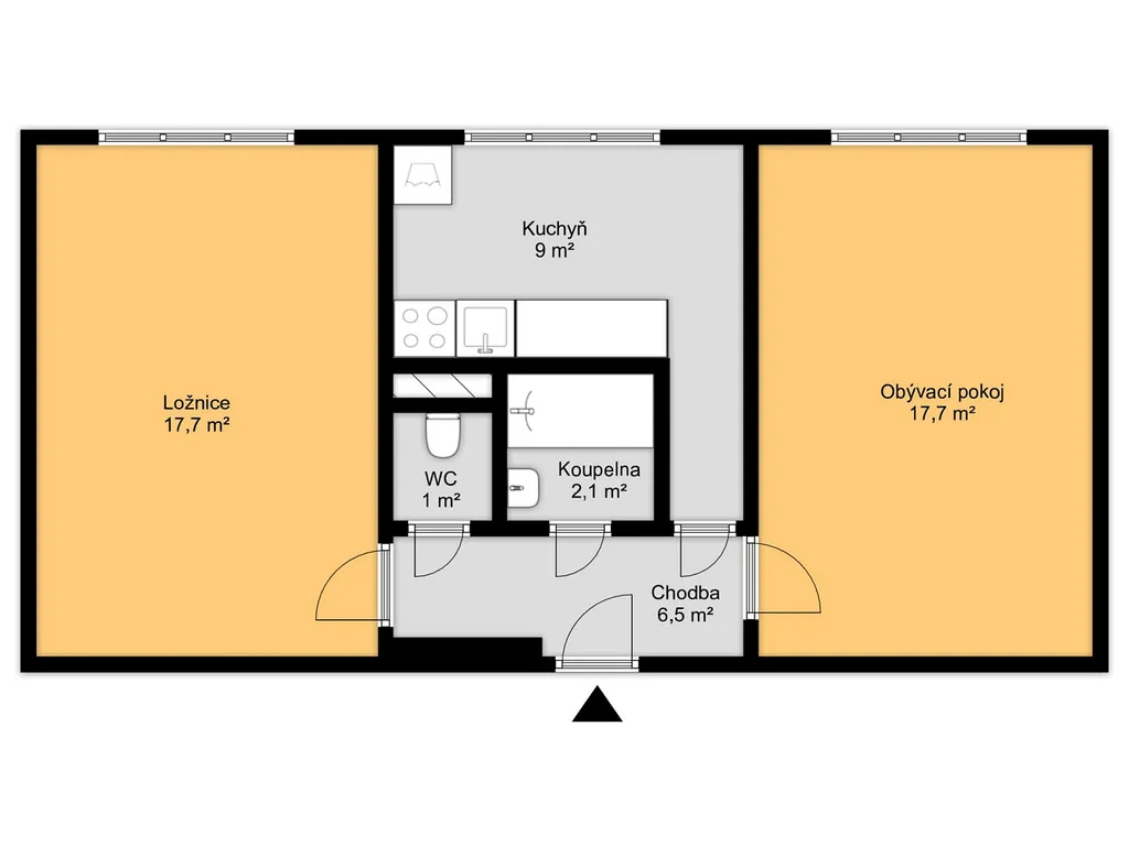 Dispozice bytu tvoří vstupní chodba, samostatné WC, koupelna s vanou a umyvadlem, ložnice, kuchyň a obývací pokoj. Pokoje jsou neprůchozí, což zajišťuje dostatek soukromí.