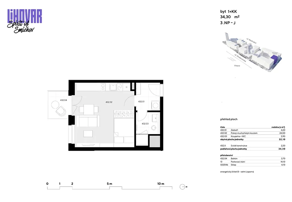 Byt o ploše 34 m2 + balkón 4 m2 se nachází ve čtvrtém patře ze sedmi novostavby.