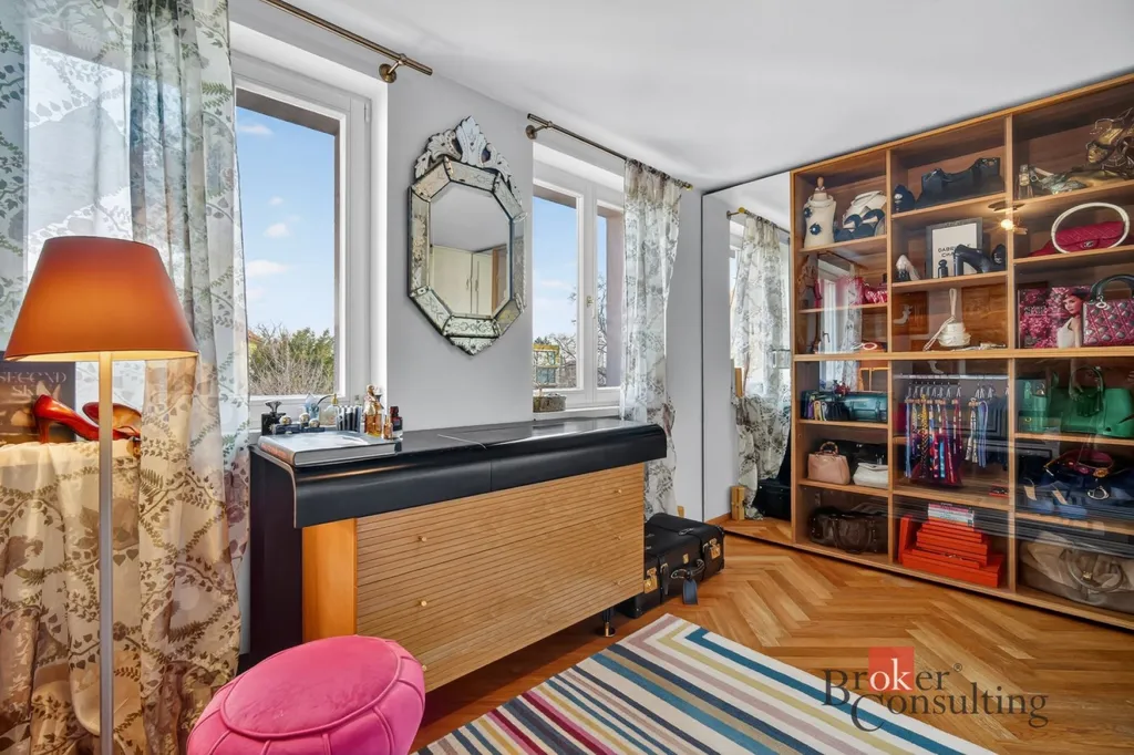 Byt zabírá celé horní patro a podkroví elegantní vily, což přináší nejen dostatek soukromí, ale také atmosféru bydlení, která se blíží rodinnému domu.