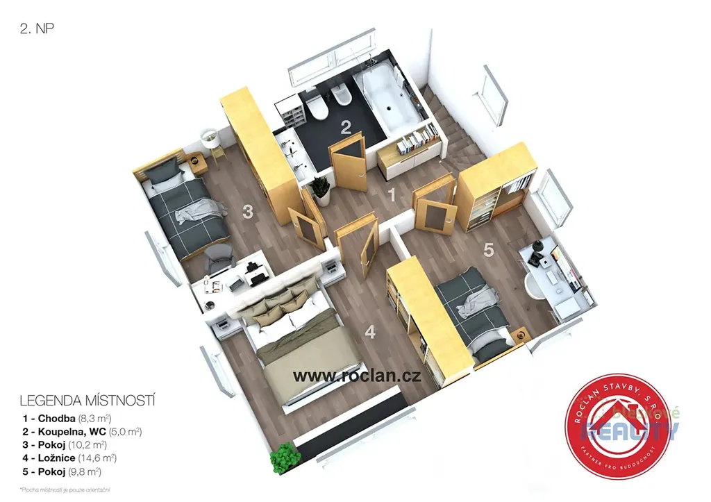 V patře je galerie, ze které se vstupuje do ložnice, dvou dalších pokojů a koupelny s WC.