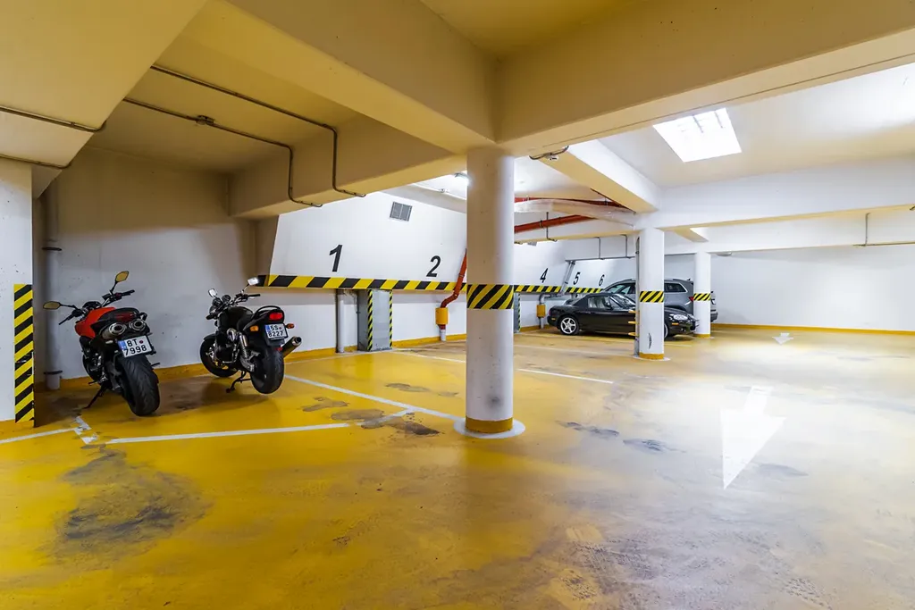 Stání se nachází v zabezpečené garáži s pohodlným vjezdem. Vjezd do garáže je na dálkové ovládání a přístup ke stání je řešen pomocí nového auto výtahu.