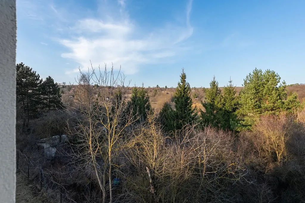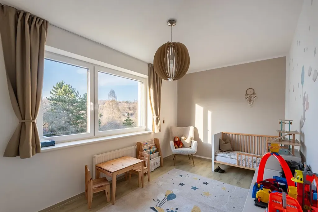 Východně orientovaná ložnice (12m2) s vestavěnou skříní a pracovním stolem nabízí příjemné ranní sluníčko a nádherný výhled do lesa. Dětský pokoj (14m2) je orientovaný na severní stranu a výhled má taktéž do zeleně. Komora (5m2) přímo na patře ihned vedle bytu, ideální pro pohodlné parkování kočárku, kol či jako rozšířená spižírna.
