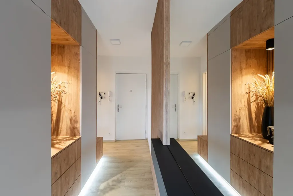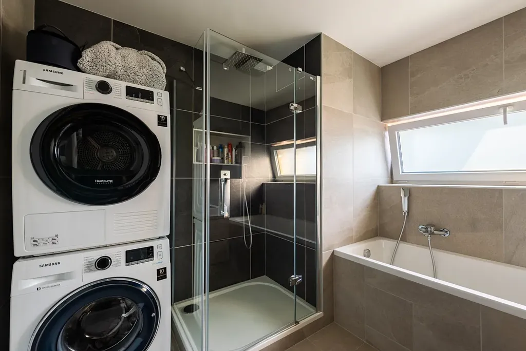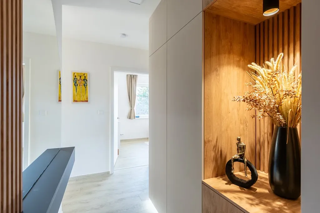 Vstupní chodba (11m2) s vestavěnou skříní, praktická šatna/pracovna (6m2) s vestavěnou skříní, pracovním stolem u okna a topením pro plnohodnotný "home office". Koupelna je vybavena sprchovým koutem a vanou a je tak prostorná, že se vejde i pračka se sušičkou. Toaleta s bidetovou sprškou a vestavěným úložným prostorem je řešena samostatně.