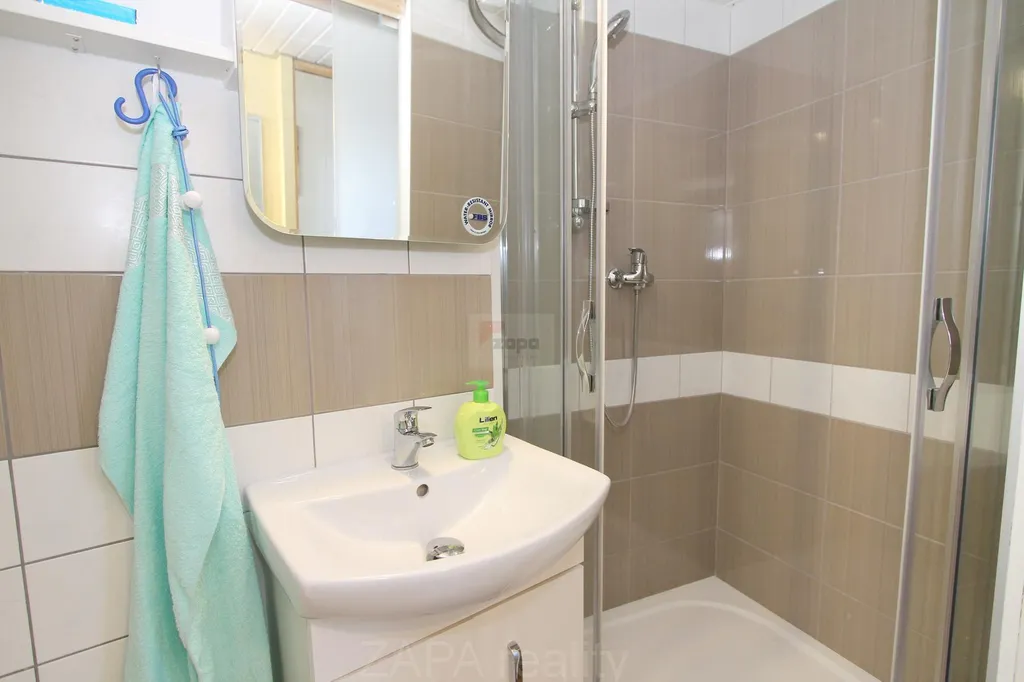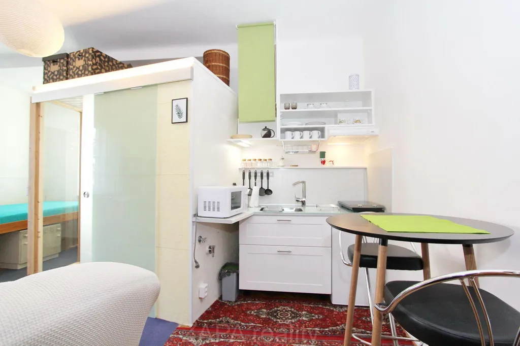 Byt je kompletně zařízen včetně lednice, myčky, avšak bez pračky, lze ji připojit v kuchyňském koutu.