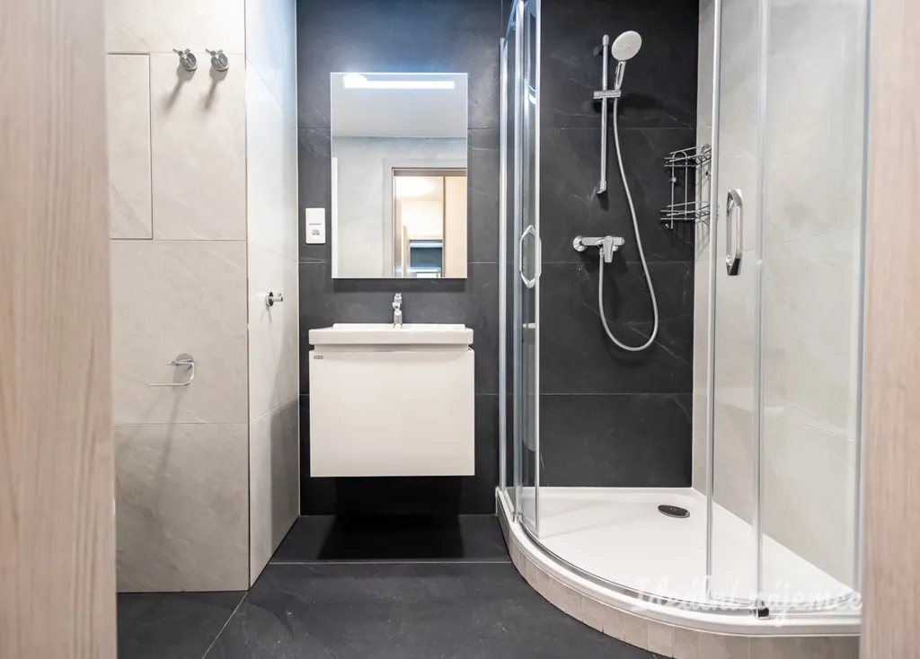 Byt se nabízí volný k zařízení dle vlastních představ. Kuchyňský kout je vybaven kuchyňskou linkou, vestavěnou chladničkou, myčkou, elektrickou troubou, mikrovlnnou troubou, varnou deskou a digestoří. V obytné části je k dispozici stůl. V koupelně najdete sprchový kout, umyvadlo, zrcadlo, koupelnovou skříňku a závěsné WC.