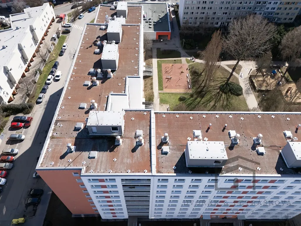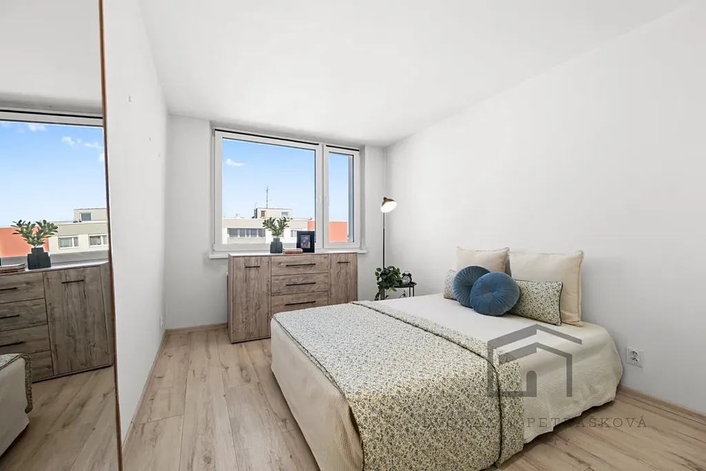 Byt s podlahovou plochou 78 m2 a lodžií 7 m2 se nachází v posledním 8.patře (9.NP) s okny na jih a sever. Bytová jednotka prošla v posledních letech kompletní rekonstrukcí a disponuje chodbou, kde je možnost si dle svého uvážení zařídit šatnu, vstupem do jednotlivých pokojů a do obývacího pokoje s kuchyní. Ložnice i dětský pokoj mají stejnou výměru, necelých 13 m2, okna na sever a vestavěnou šatní skříň. Dále je zde vstup do koupelny se sprchovým koutem, na oddělenou toaletu s bidetovou sprškou a do technické místnosti, kam se vejde pračka, sušička i věci, které nepotřebujete. Centrem domova je slunný a zároveň prostorný obývací pokoj (orientace na jih) s kuchyňským koutem a ostrůvkem (30 m2), zde je i přístup na velkorysou lodžii s příjemným výhledem do okolí. Kuchyně je vybavená indukční sklokeramickou deskou, digestoří s odtahem do komína, horkovzdušnou troubou, dostatkem úložného prostoru, lednicí a ostrůvkem.