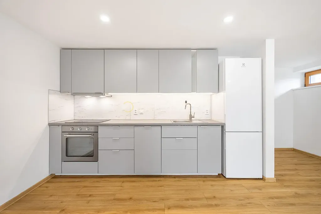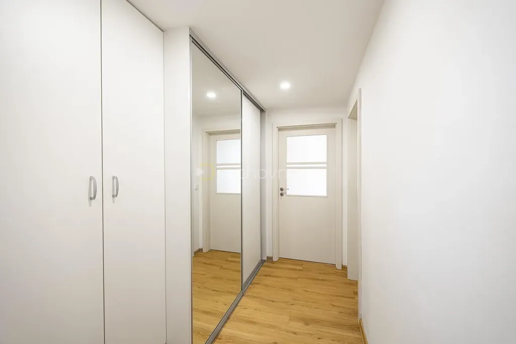 Byt nabízí plně vybavenou kuchyňskou linku, dřevěnou plovoucí podlahu, dřevěná okna se žaluziemi.