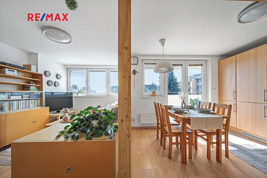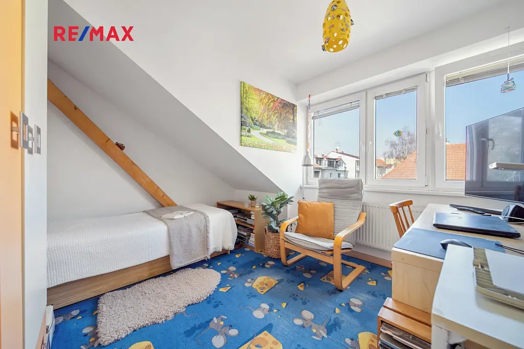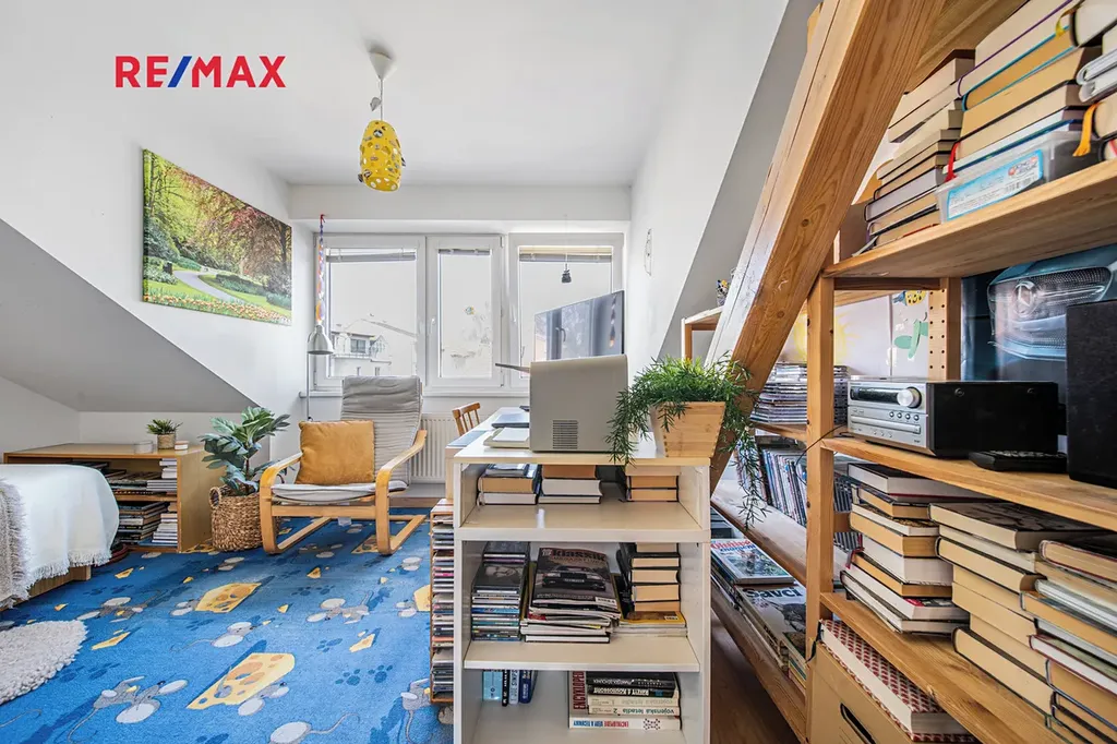 Šikmé stropy a přiznané trámy dodávají každé místnosti osobitý charakter. Součástí bytu je lodžie (5 m²) s jižní orientací a výhledem do klidných zahrad.