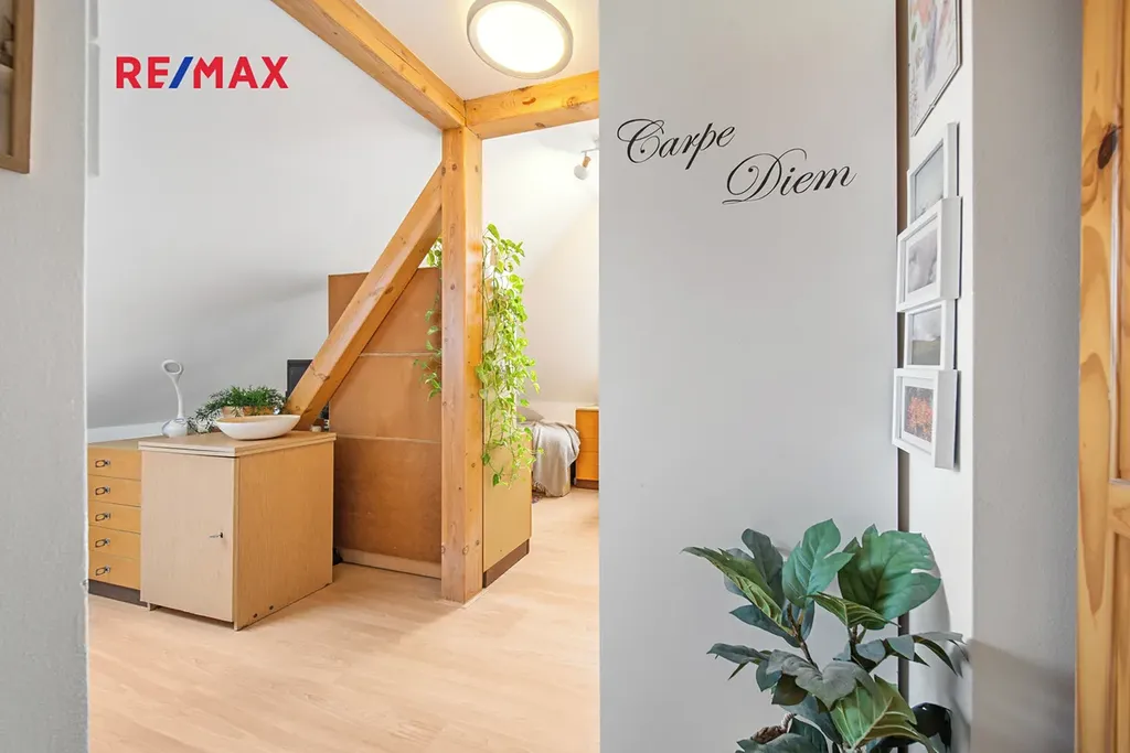 Byt se nachází v nejvyšším patře historického domu z roku 1928, jehož celé podkroví prošlo v roce 2013 kompletní přestavbou — nová střecha, nová vestavba z Ytongu. Dominantou interiéru jsou přiznané dřevěné trámy — připomínka toho, že dům má příběh. V kombinaci se šikmými stropy vytvářejí osobitou atmosféru, kterou v běžné novostavbě hledáte jen těžko.