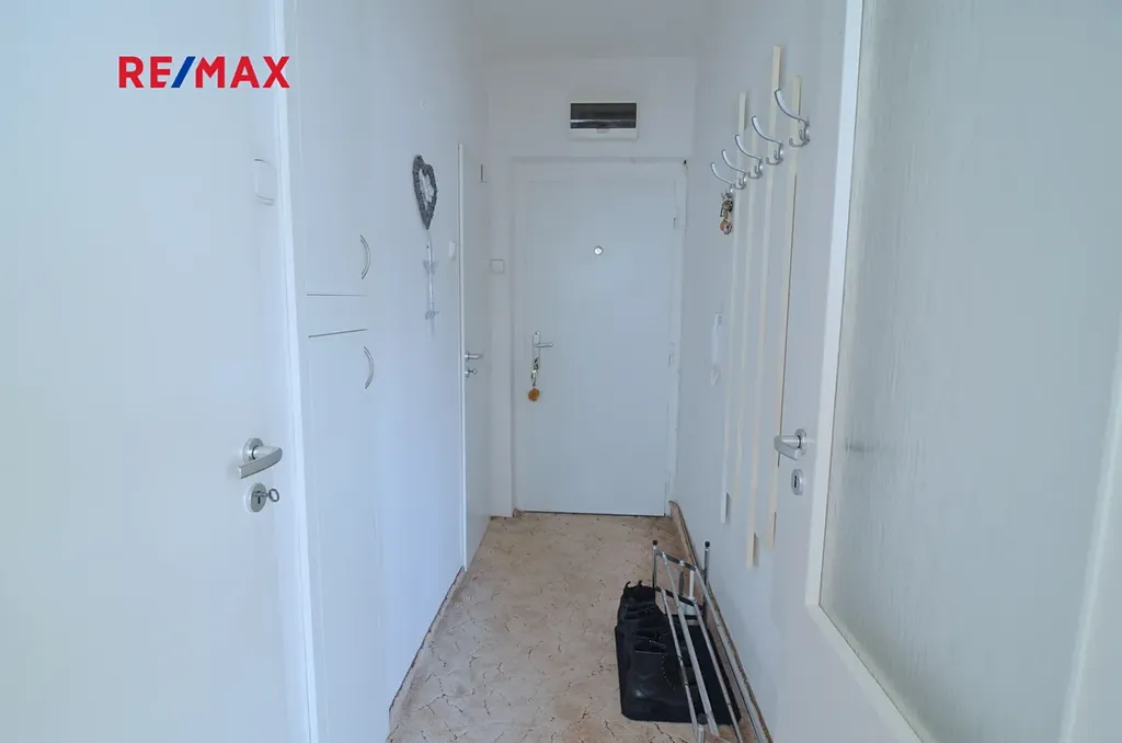 V předsíni je další menší vestavěná skříň, botník a věšák na stěně.