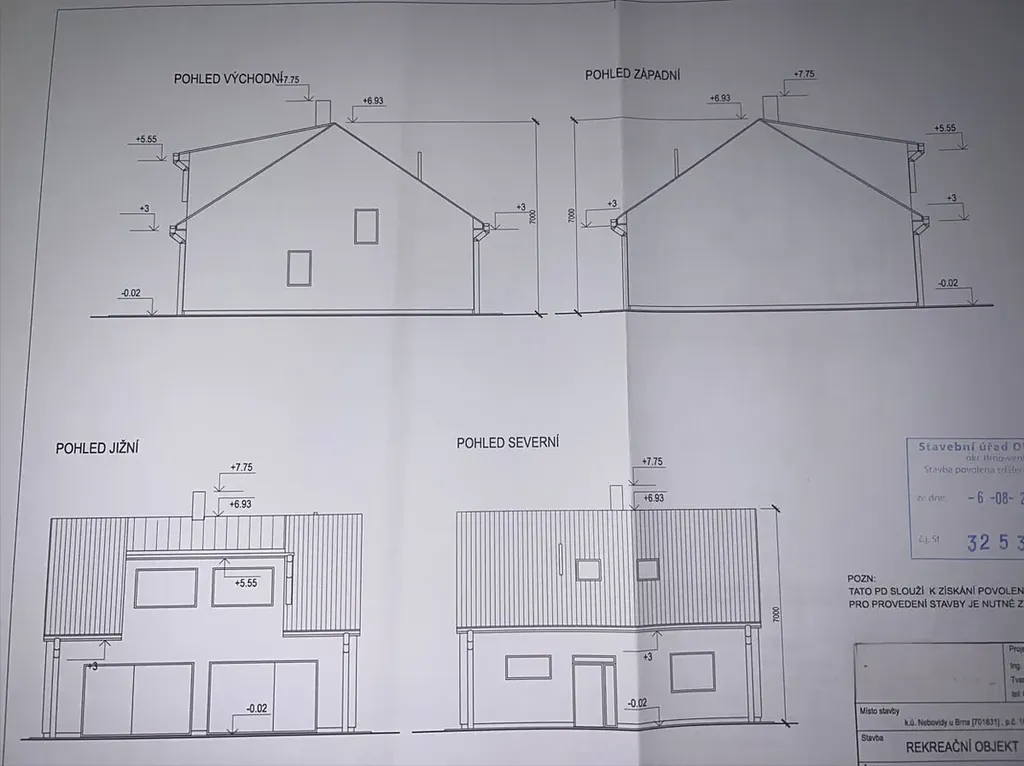 Na pozemek bylo vydáno pravomocné stavební povolení a vypracován projekt domu o zastavěné ploše 100 m² a dispozici 5+kk s obytným podkrovím a podlahovou plochou přibližně 166 m². Dům je navržen na půdorysu 10 × 10 m a uliční šíře pozemku činí přibližně 14,5 m. Nový majitel může projekt převzít nebo upravit dle svých představ formou změny stavby před dokončením. Součástí je rovněž stavební povolení na čistírnu odpadních vod. Na pozemku je elektřina a vlastní vrtaná studna, přístup je zajištěn po obecní komunikaci.