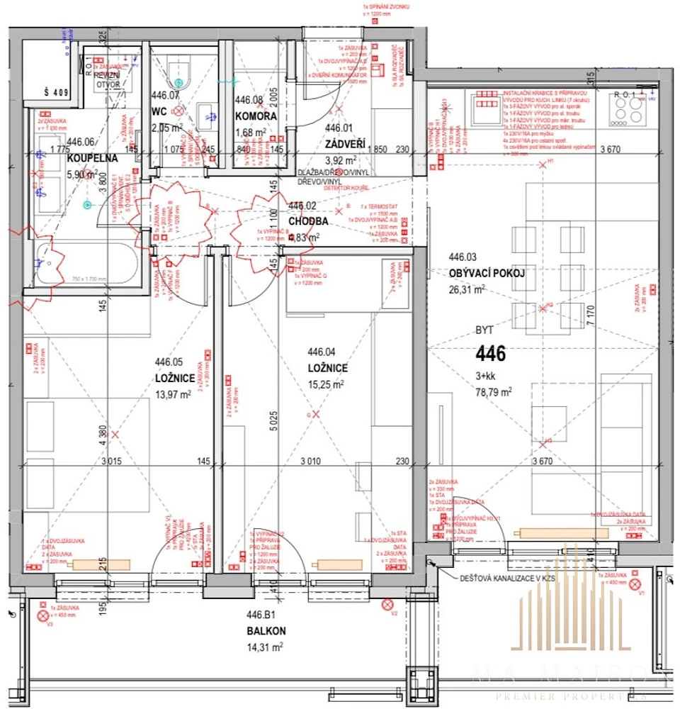 Byt se nabízí jako nezařízený a sestává ze vstupní předsíně, komory, koupelny, toalety, obývací části, která je spojená s kuchyní a dvěmi dalšími pokoji. Součástí obývací místnosti je kuchyňská linka, která je vybavená lednicí s mrazákem, varnou deskou, troubou, mikrovlnnou troubou a myčkou. Všechny spotřebiče jsou zn. Electrolux. Linka je rozdělena do dvou částí, kdy část, kde se nachází varná deska, je na samostatném baru. Zároveň linka nabízí spoustu úložného prostoru.