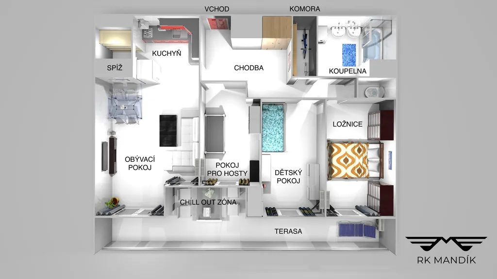 Dále se v bytě nachází dětský pokoj 11,89 m², pokoj pro hosty 9,58 m² a ložnice 12,11 m². Koupelna o rozloze 6,14 m² nabízí 2 umyvadla, vanu se zástěnou a pračku. V bytě nechybí ani samostatné WC 1,21 m² a komora s výměrou 2,12 m², ve které nechybí policový systém, díky kterému je zaručen dostatek úložného prostoru.