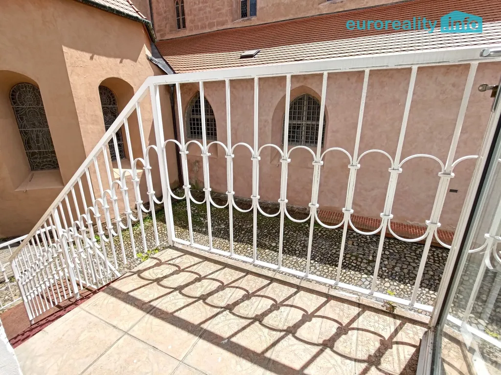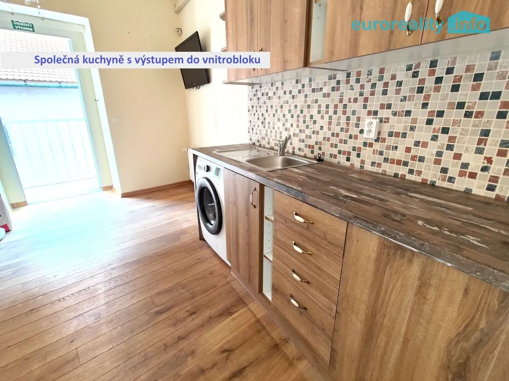 Pokoje jsou ve dvou úrovních. Ve spodní úrovni je jeden pokoj a kuchyně s výstupem do na balkon se schody do klidného vnitrobloku.
