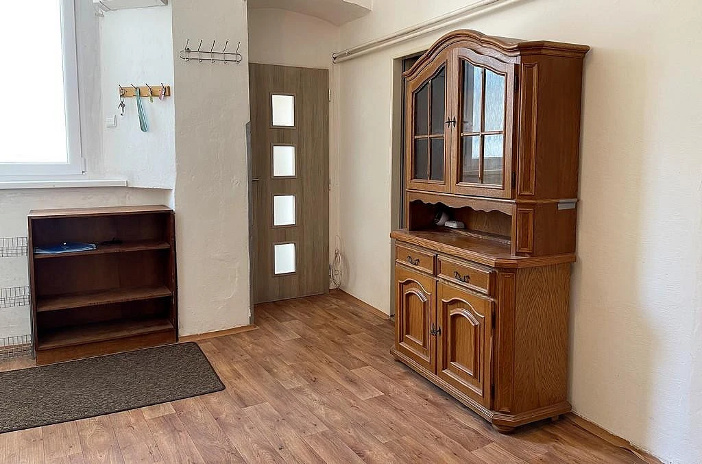 Za vstupními dveřmi se nachází prostorná chodba o výměře cca 12 m and sup2;, která je vybavena menší částečně prosklenou skříní. Součástí chodby je také plynový kotel, jenž zajišťuje vytápění celého bytu.