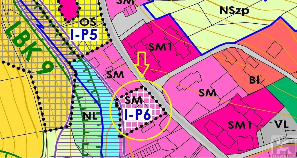 Dle platného územního plánu je pozemek určen k zastavění SM plochy smíšené obytné městské. V územním plánu je funkční plocha označena (I- P6 ). Na pozemku je navrženo parkovaní s kapacitou 25 míst ( I-P6) a na zbylé části lze realizovat stavbu z plochy SM.