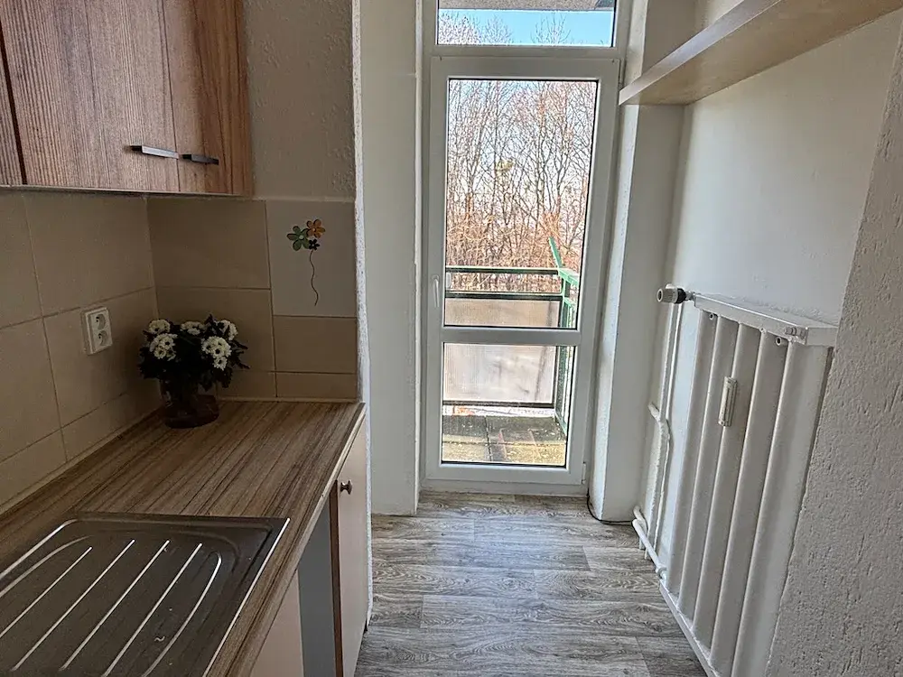 Dispozice bytu: kuchyň s balkónem, pokoj, předsíň s vestavěnou skříní, koupelna, WC.