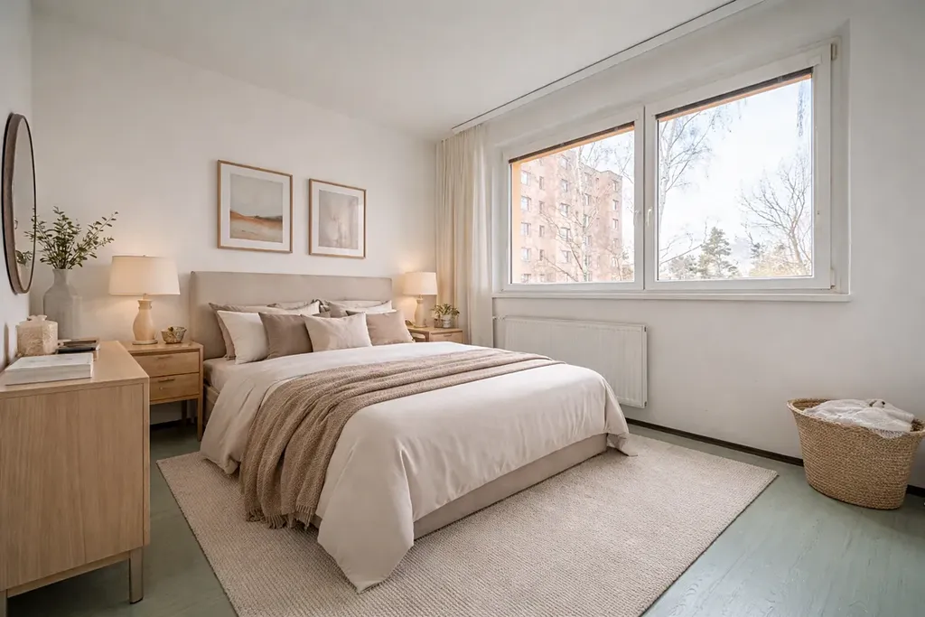 Dispozice bytu nabízí prostorný obývací pokoj se vstupem na balkon, dvě samostatné ložnice, kuchyň s jídelním prostorem, koupelnu s vanou, samostatné WC a praktickou chodbu s dostatkem úložných prostor. Byt je světlý, působí příjemným a vzdušným dojmem.