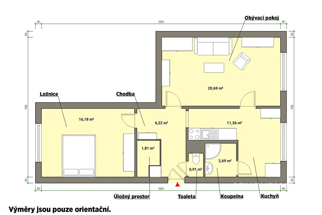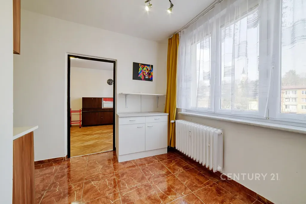 Dominantou bytu je prostorný obývací pokoj propojený s kuchyní, který tvoří světlé centrum domova. další pokoj je neprůchozí a může sloužit jako ložnice či dětský pokoj. Prostorná chodba slouží jako bonus a zajistné oceníte také komoru navíc.