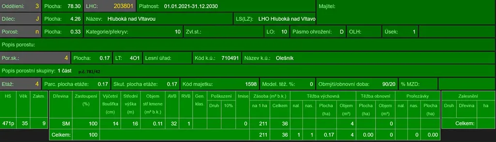 - p.č. 781/42 vedená jako lesní pozemek o celkové výměře 3 353 m2 (stáří 91 lesa let - zastoupení dřevin dub, olše, stáří lesa 40 let - zastoupení dřevin smrk),