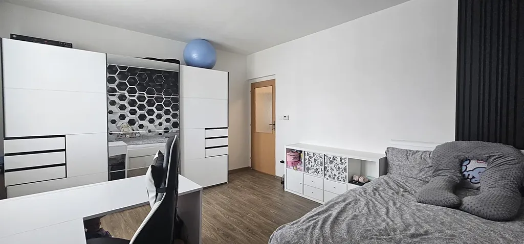 Pokoj: postel, velká šatní skříň, psací stůl, židle.