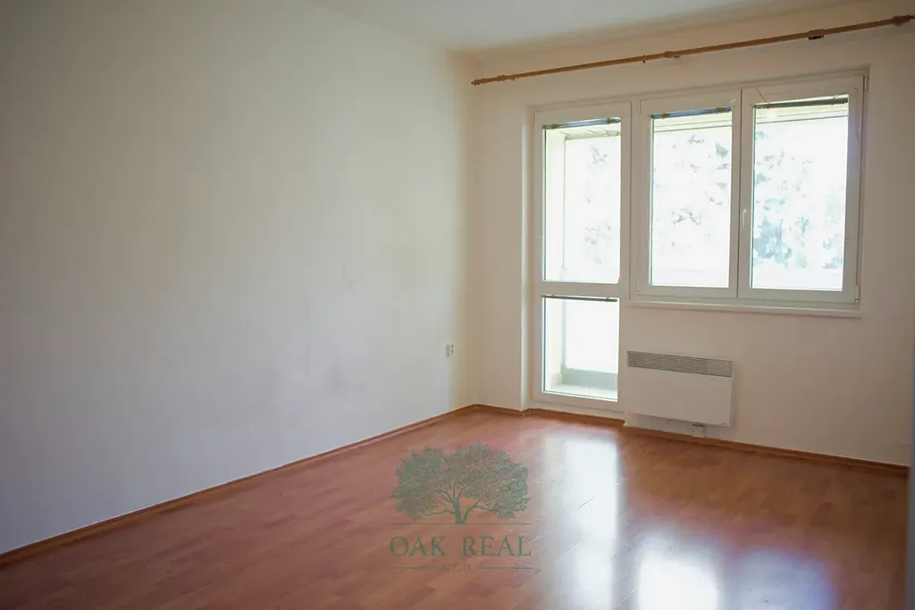 Jeden z pokojů má okno a lodžii orientovanou na jih s výhledem na Komenského náměstí. Díky zasklené lodžii je pokoj příjemně prosvětlený, zároveň je v letních měsících částečně chráněn vzrostlou zelení před domem. Druhý pokoj je orientován na sever do ulice Družstevní s výhledem do klidné zeleně. Také zde se nachází zasklená lodžie, která umožňuje její využívání i v chladnějších měsících. V případě potřeby lze tento pokoj propojit s kuchyní, která je oddělena pouze lehkou zděnou příčkou. Kuchyňská linka je plně funkční a vedle velkého okna je připraven prostor pro umístění lednice.