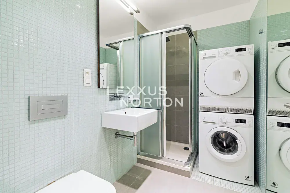 Vstupní chodba je vybavena vestavěnou skříní. Kuchyňský kout disponuje sklokeramickou varnou deskou, troubou, lednicí s mrazákem, mikrovlnnou troubou a myčkou nádobí, přičemž všechny spotřebiče jsou značky Miele. Koupelny jsou vybaveny sprchovým koutem a toaletou; k dispozici je také pračka a sušička.