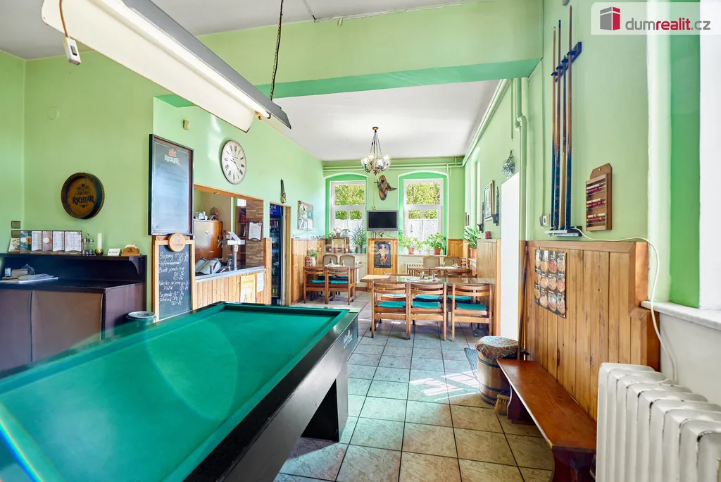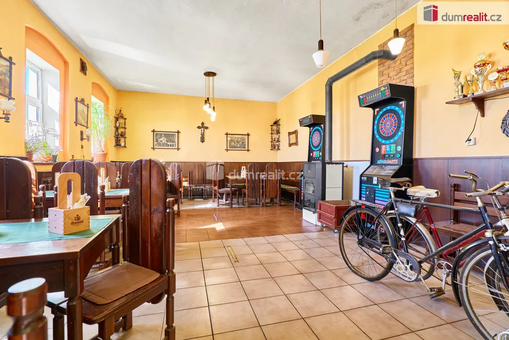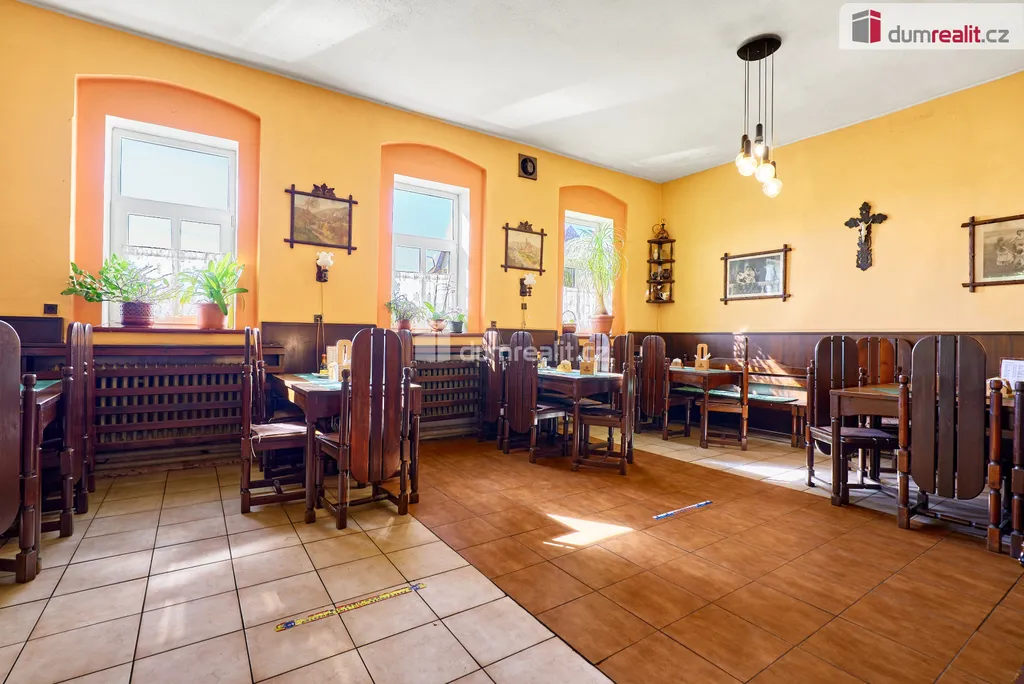 Dumrealit.cz Vám zprostředkuje prodej zavedené a oblíbené restaurace s penzionem "Rafanda" v obci Hroznětín na úpatí Krušných hor. V přízemí objektu je restaurace (25 míst) a salonek (35 míst), výčep, kuchyně, sklady, WC a kotelna, ve které je umístěn plynový kotel a el. bojlery. V prostoru restaurace jsou krbová kamna s výměníkem. V 1. patře jsou 4 pokoje s celkem 11 lůžky, společné sociální zařízení (WC a sprchy) a kuchyňský kout. V podkroví je byt 2+1. Sklep je využíván jako sklad nápojů. Na zahradě je venkovní posezení se 60 místy a samovýčep pro cyklisty a turisty. Budova je zateplená, na části je nová střecha. Objekt leží na hlavním silničním tahu do Krušných hor, v těsné blízkosti cyklostezky, která je součástí místní široké sítě cyklistických, turistických a běžeckých tras, vlakové a autobusové stanice. V obci je všechna potřebná občanská vybavenost. Možnost investičně využít jako ubytovnu pro zaměstnance s vlastní jídelnou. Koupě je možná i kombinací s jinou nemovitostí. Ev. číslo: 647398.