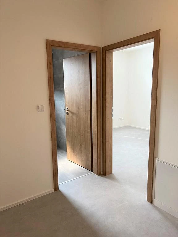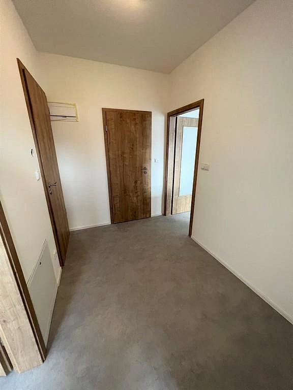 Za vstupními dveřmi se ocitneme ve velmi prostorné chodbě o velikosti cca 5,60 m², ze které se vchází do všech samostatných místností v bytě. Toaleta je zde samostatná o výměře cca 1,85 m², která disponuje WC a umyvadlem. V koupelně o výměře cca 4,65 m² je sprchový kout, umyvadlo se skříňkou, vývod na pračku a elektrický boiler zajišťující ohřev vody. Ložnice o výměře 12,50 m² je nevybavená. Hlavní místností v bytě je obývací pokoj s kuchyní o celkové ploše cca 24,52 m². Kuchyňský kout je velmi vkusně zařízený nejen pěknou kuchyňskou linkou, ale samozřejmostí jsou i spotřebiče, myčka, digestoř, trouba, sklokeramická deska. Dominantou této místnosti je úžasná prostorná terasa o celkové ploše cca 11 m².