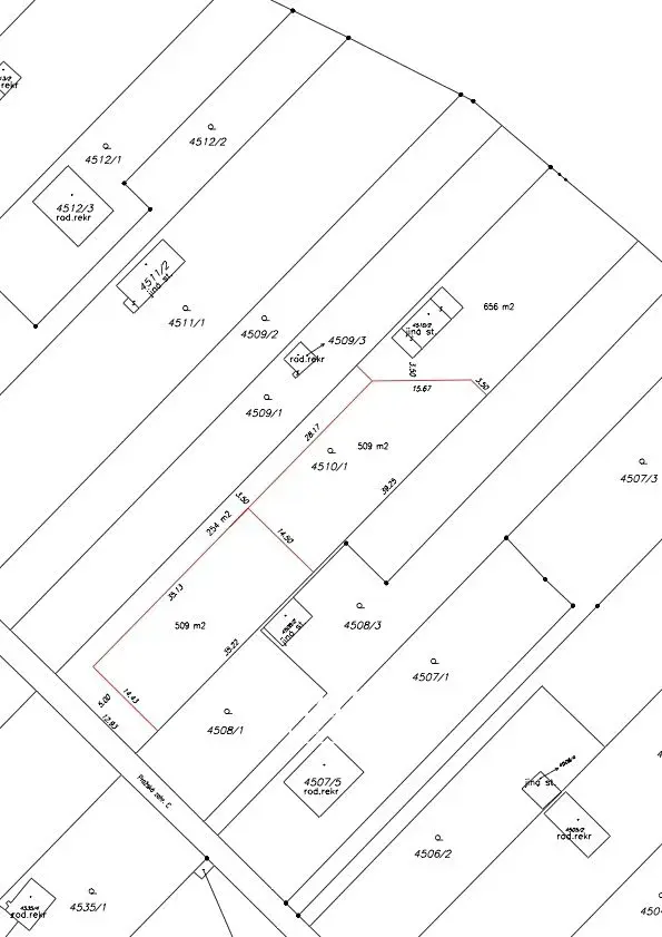 Dle katastrální mapy je pozemek rozdělen na 4 části, a to dvě parcely o rozloze 509 m², jedna o rozloze 656 m² a parcela 311 m², by případně sloužila jako společná cesta ke všem jmenovaným parcelám. Tím je pozemek vhodný i pro stavbu dalších 2 rekreačních chat k pronájmu nebo dalšímu prodeji.