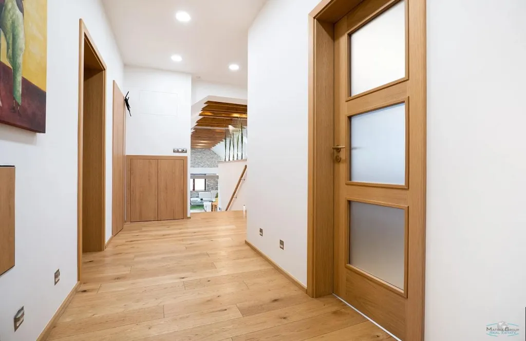 Dům má dubové podlahy, dřevěná okna Vekra s trojskly, optimální teplotu zajišťuje