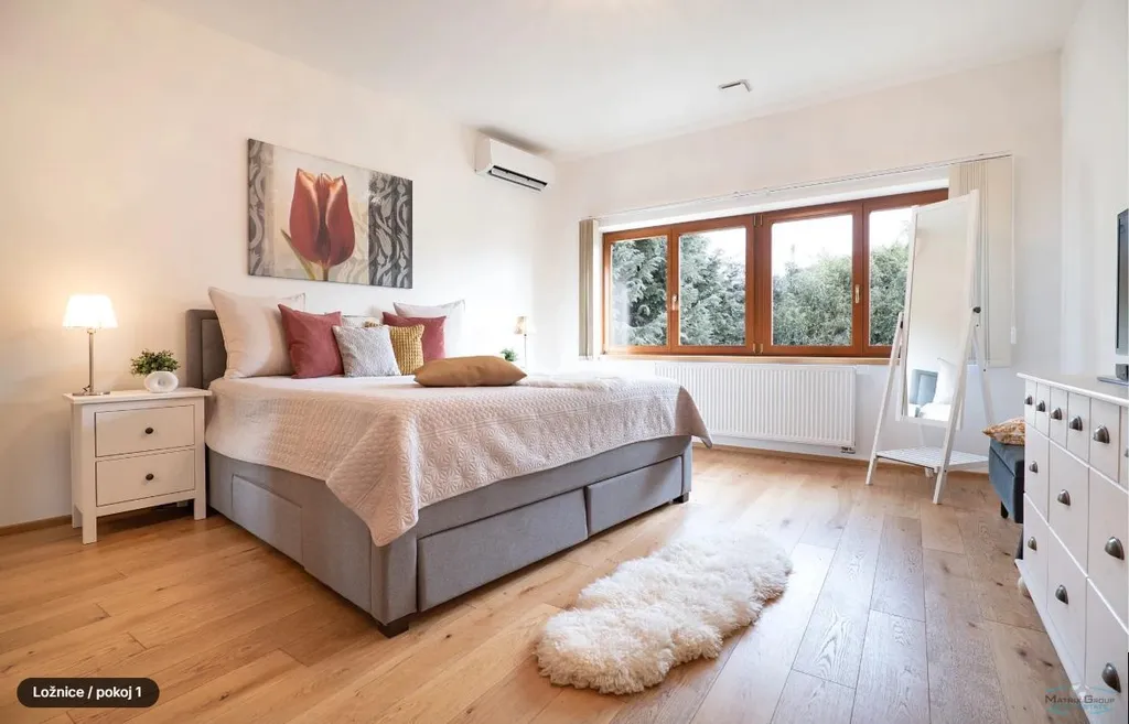 V 1. patře jsou dvě ložnice (21+19m2), koupelna (11m) s masážní vanou i sprchovým koutem a velkým