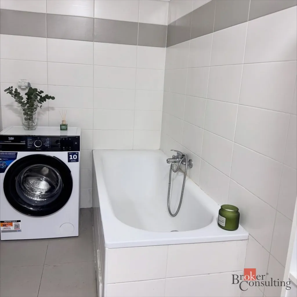 Koupelna je vybavena vanou a nechybí ani prostor pro umístění pračky. Toaleta je řešena samostatně.