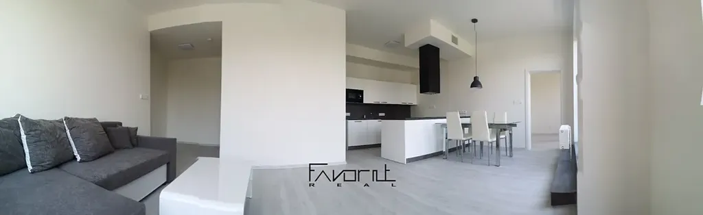 V bytě je vše nové a nepoužité (podlahy, sanita, kuchyňská linka na míru včetně el. trouby, el. varné desky, myčky a digestoře).