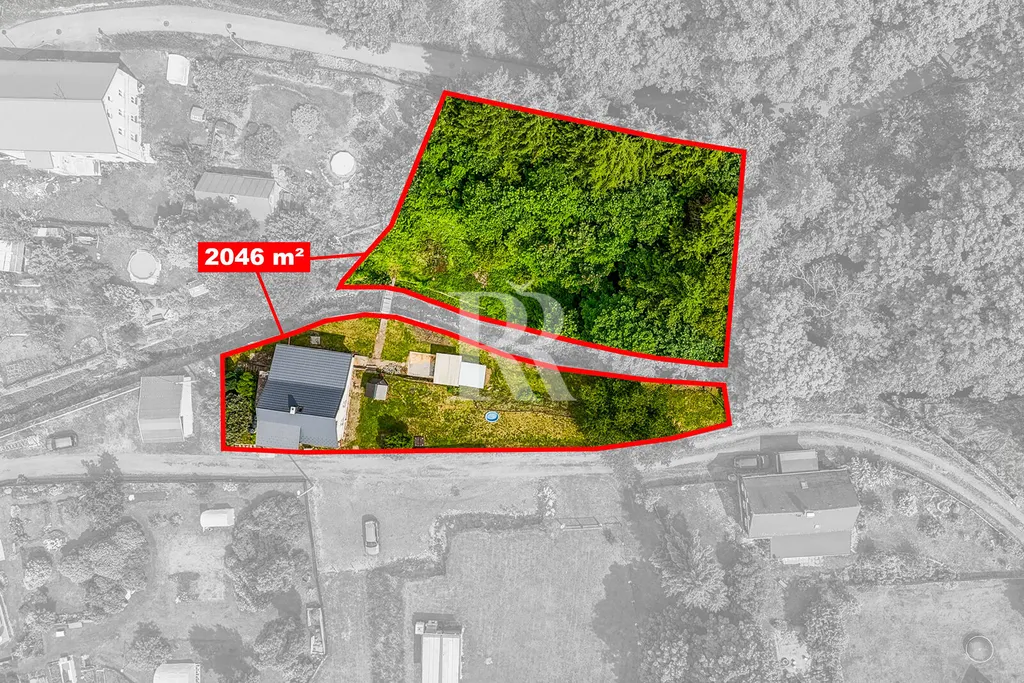 Pozemek o celkové výměře 2046m2 je přibližně na dvě poloviny rozdělen korytem potoka.