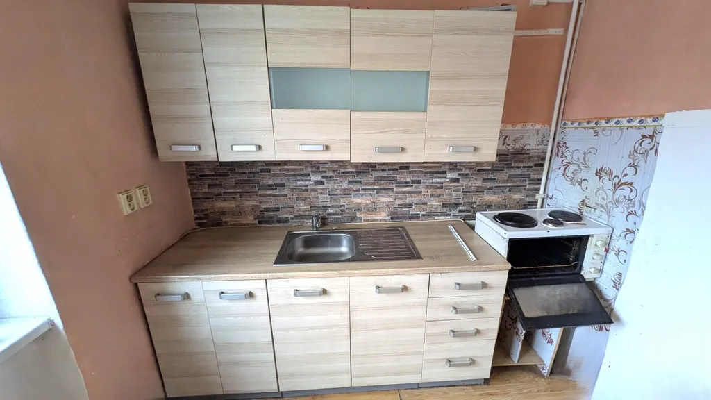 V kuchyni je kuchyňská linka a elektrická trouba s mikrovlnkou. V koupelně je vana, umyvadlo a WC. Místnosti jsou prostorné. Součástí vybavení obývacího pokoje jsou skříně a komody, je zde tedy dostatek úložných prostor. Byt nabízí velmi příznivé měsíční náklady, díky čemuž je ideální volbou pro jednotlivce.