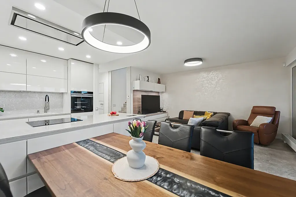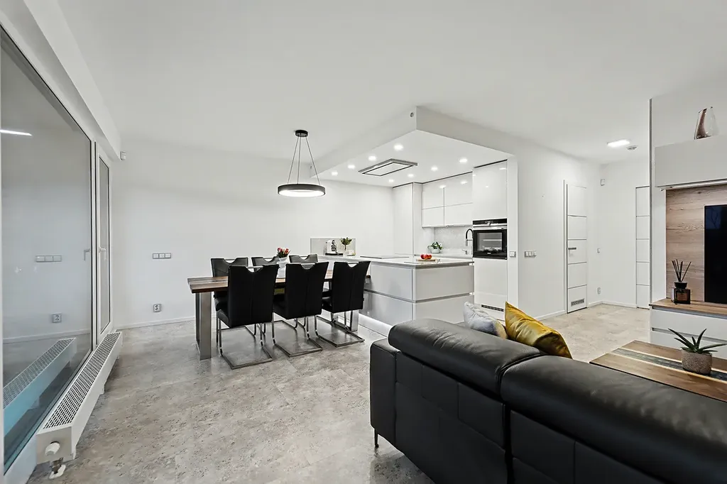 Dominantu domu tvoří velkorysý obývací pokoj s luxusní kuchyní (31,68 m²) značky Beneš. Kuchyň plně vybavena špičkovými spotřebiči Siemens. Světlý obývací pokoj je místo, kde se potkává rodinný život s relaxací. Velká okna a přímý vstup na terasu propojují interiér se zahradou a vytvářejí příjemnou atmosféru v každém ročním období. Bezpečnostní a venkovní žaluzie.