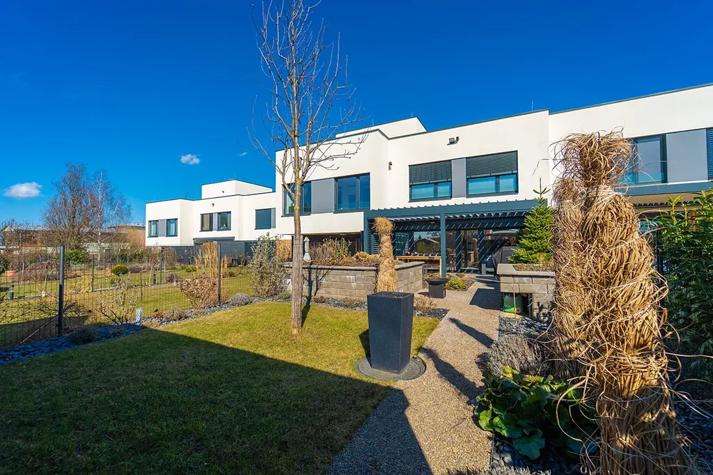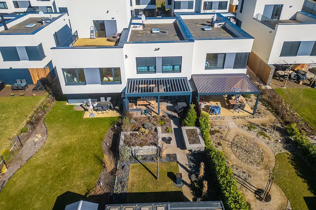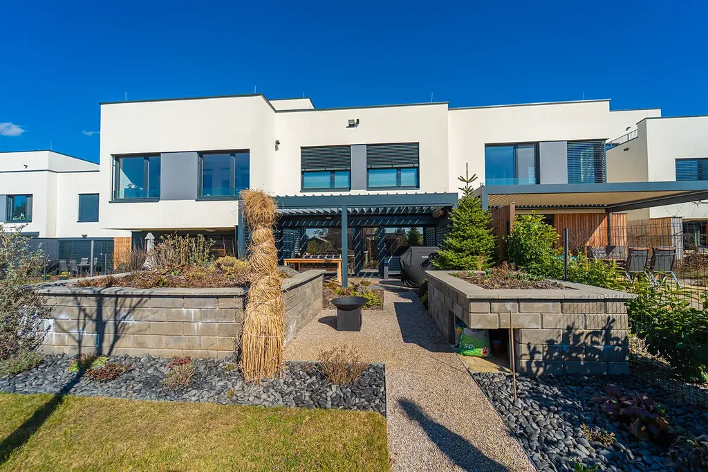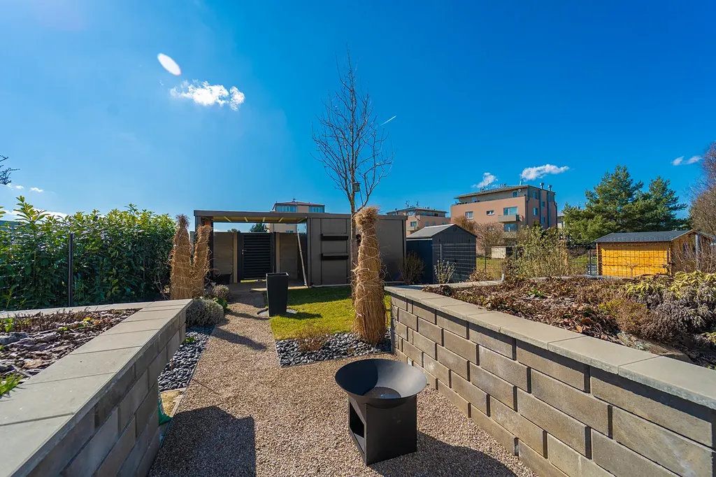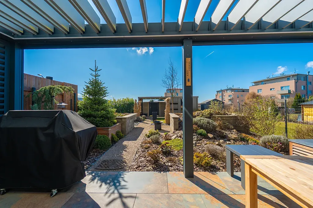 Pěkná zahrada nabízí soukromí pro odpočinek i posezení s přáteli. Součástí zahrady krytá terasa (21 m²) s bioklimatickou pergolou, screeny a osvětlením, které umožňují komfortní využití terasy po většinu roku. V zadní části zahradní domek.