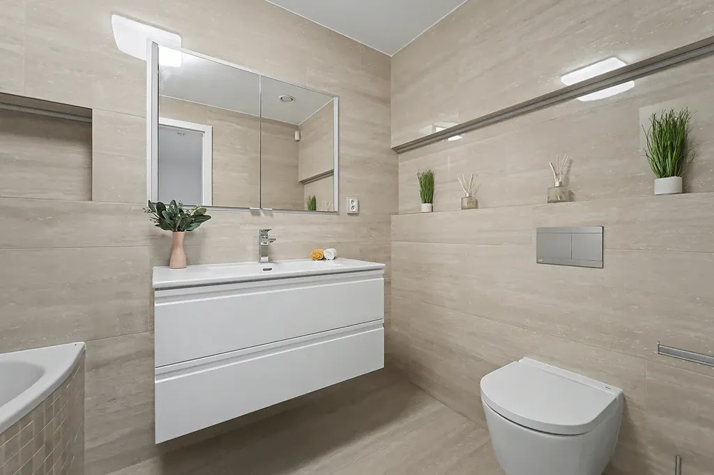 Vedle ložnice se nachází druhá luxusní koupelna s vanou a toaletou (5,38 m²). Velkoformátové obklady a dlažba v nadčasovém designu, doplněná sofistikovaným led osvětlením pro dokonalou atmosféru.