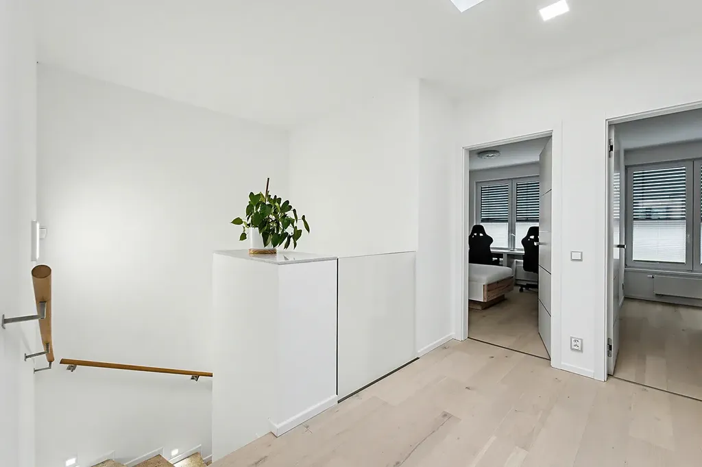 Na dětský pokoj navazuje pokoj pro hosty či pracovna (12,43 m²), rovněž orientována na jih s výhledy do zeleně, která poskytuje zázemí pro práci a klid. Samozřejmostí jsou venkovní sluneční žaluzie ve všech pokojích, které zajišťují příjemné klima i soukromí.