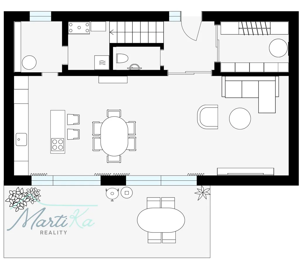 Dominantou přízemí je obývací prostor s kuchyní téměř 50 m². Místo pro společné večeře, návštěvy přátel i běžný rodinný život.